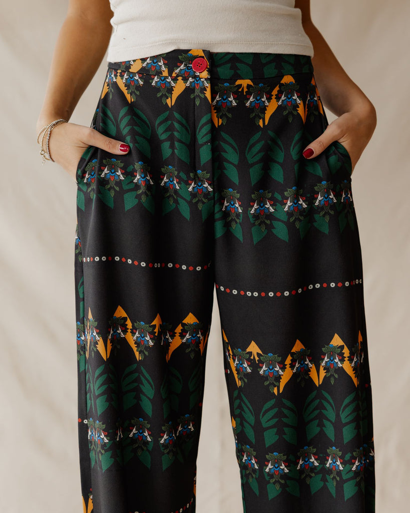 بنطلون واسع الساق أنيق وسهل الارتداء مع طبعات جريئة وملمس ناعم وتدفقي.