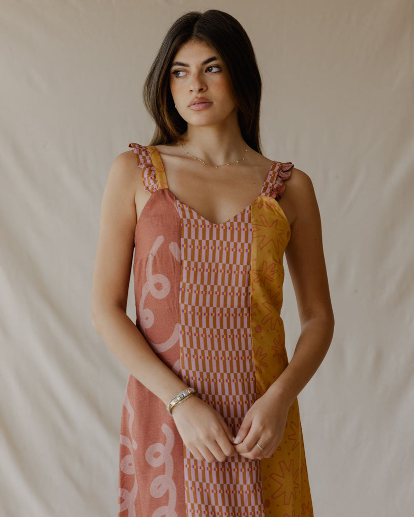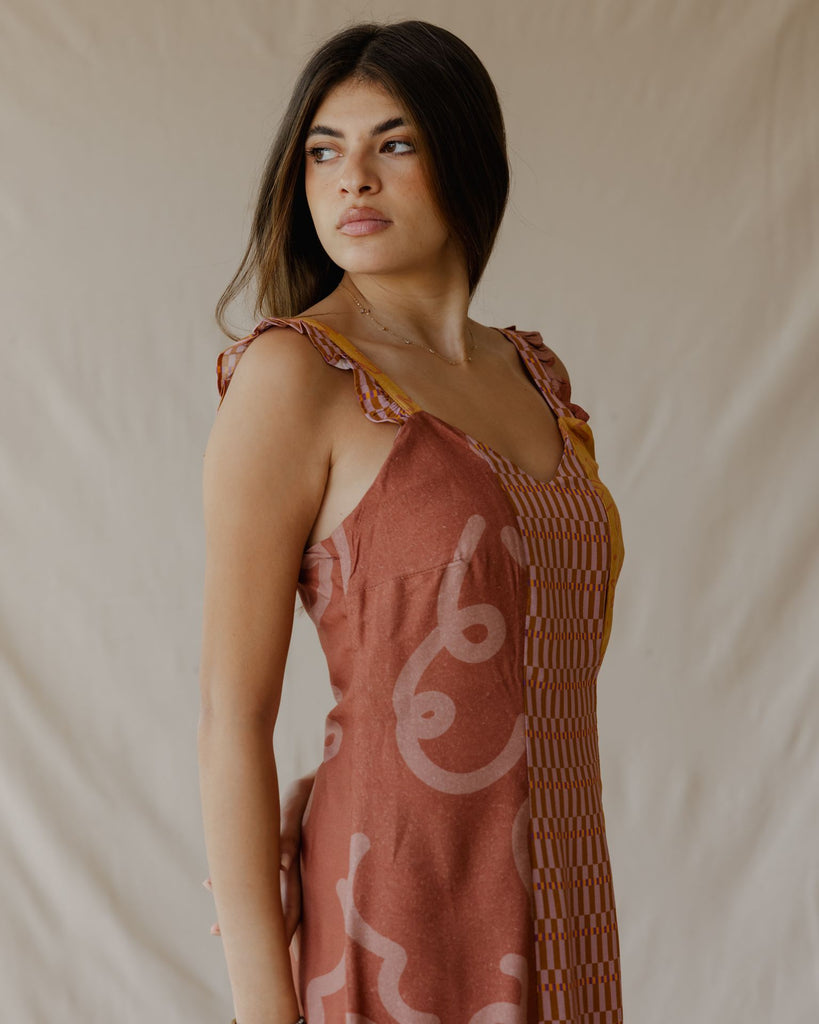 ارتدي هذا الفستان الميدي الحالم. بأشرطة مكشكشة أنثوية وشكل ناعم وانسيابي، يحمل كل جزء من الفستان نقشًا فريدًا، مما يمنحه لمسة فنية فريدة. مثالي لمغامراتك في الطقس الدافئ أو صباحات نهاية الأسبوع الهادئة.