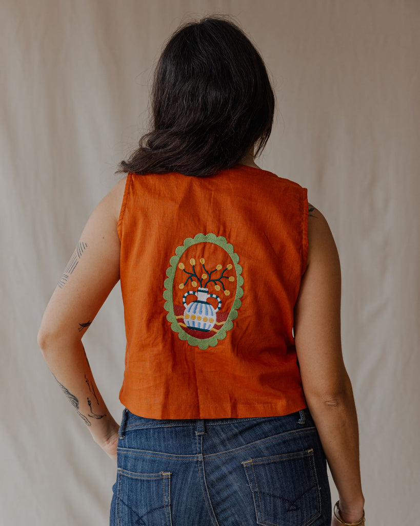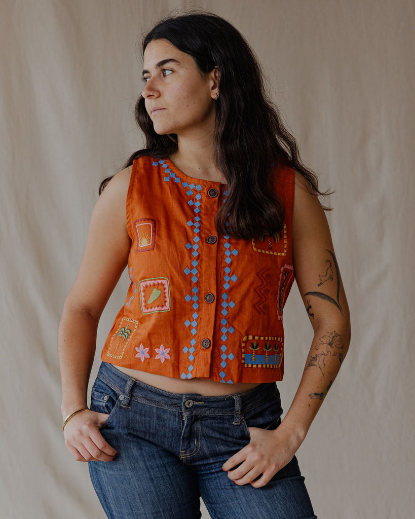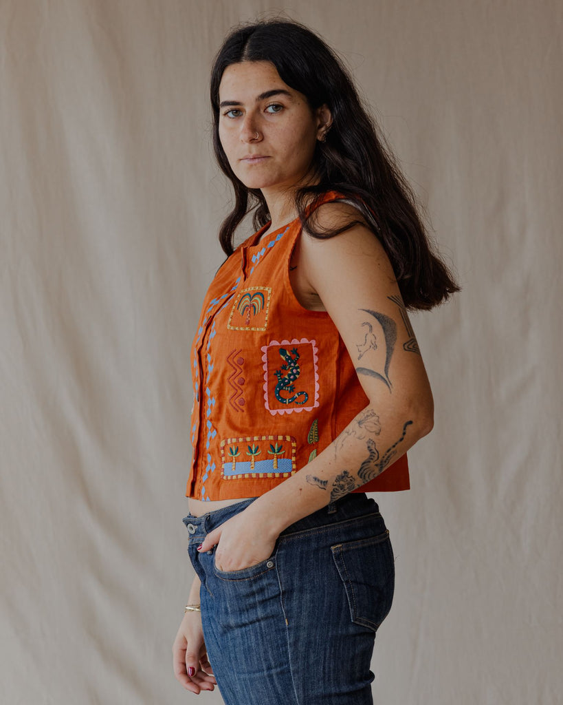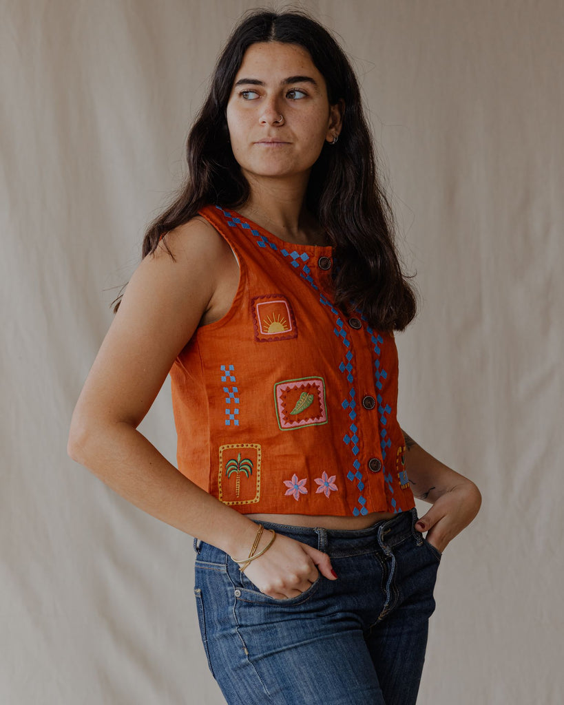 تتميز هذه السترة الكتانية بتفاصيل رقعة مطرزة، مما يمنحها لمسة فنية مميزة. خفيفة الوزن ومتعددة الاستخدامات، مثالية للارتداء فوق ملابس أخرى أو لإضفاء لمسة مميزة.