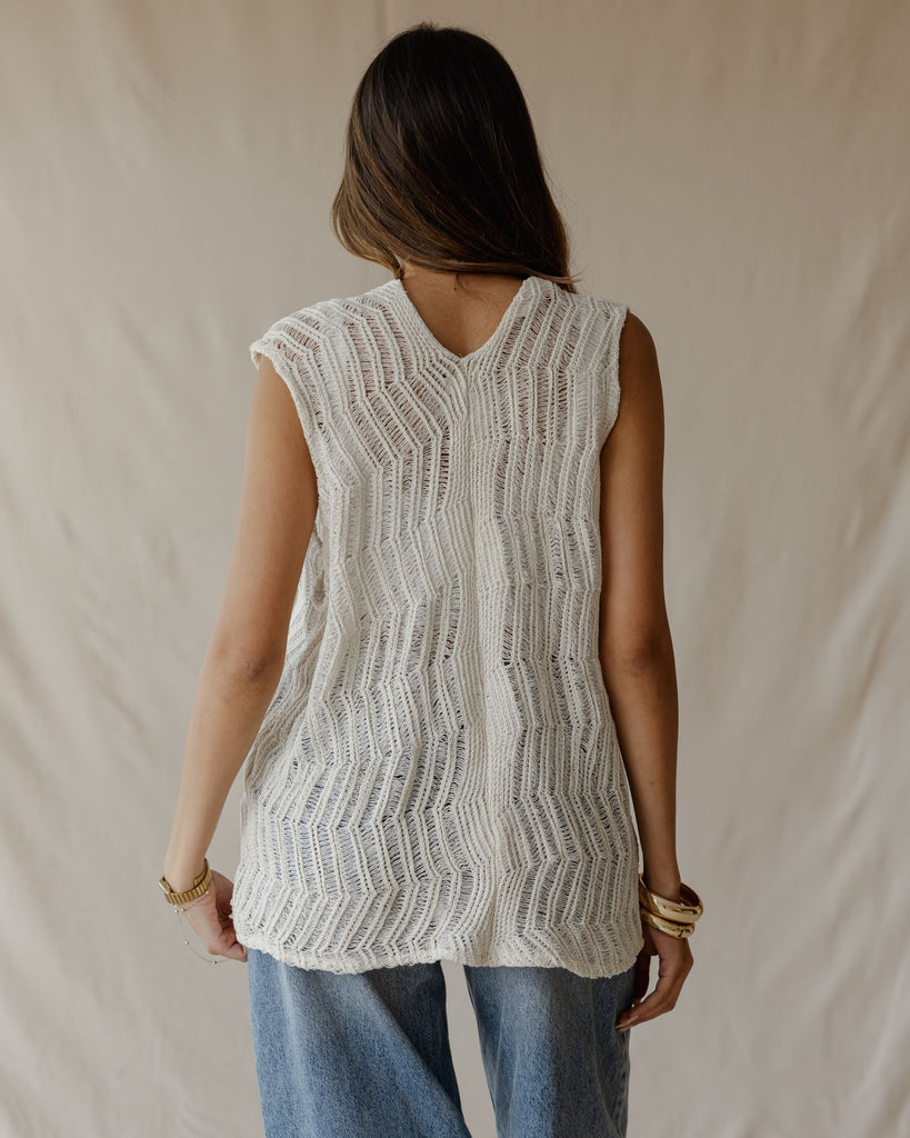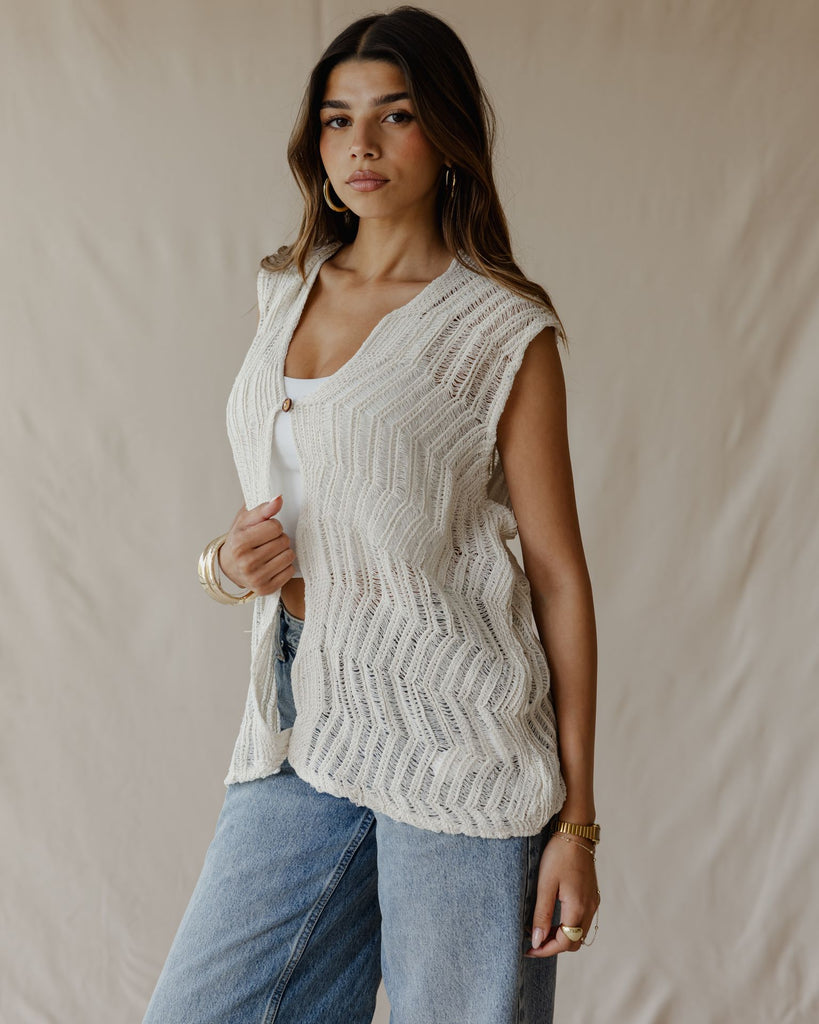 تتميز هذه السترة المحبوكة بدون أكمام المصنوعة يدويًا بملمس ناعم وجيد التهوية مع نمط مفتوح متموج وإغلاق بزر أمامي واحد.