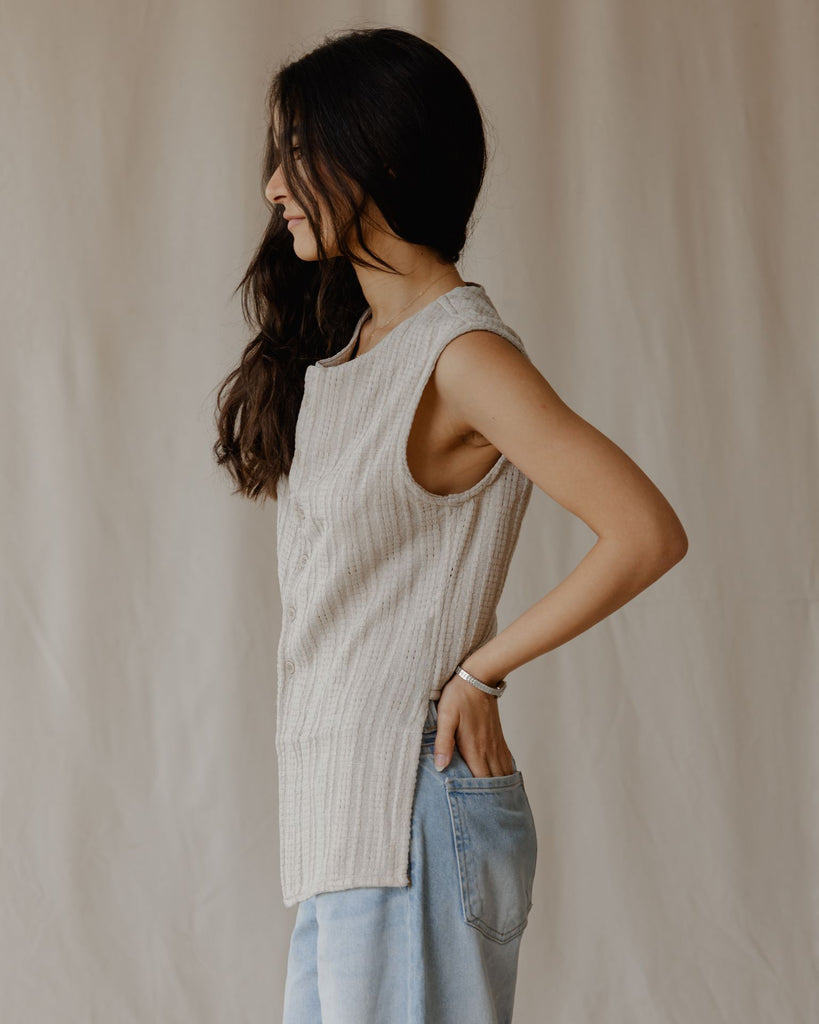 تضفي هذه السترة ذات التصميم البسيط لمسة عصرية على الأسلوب اليومي بفضل قطعها غير المتماثلة وثنياتها السهلة.