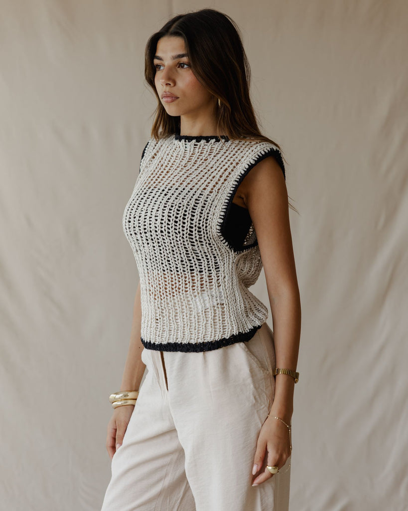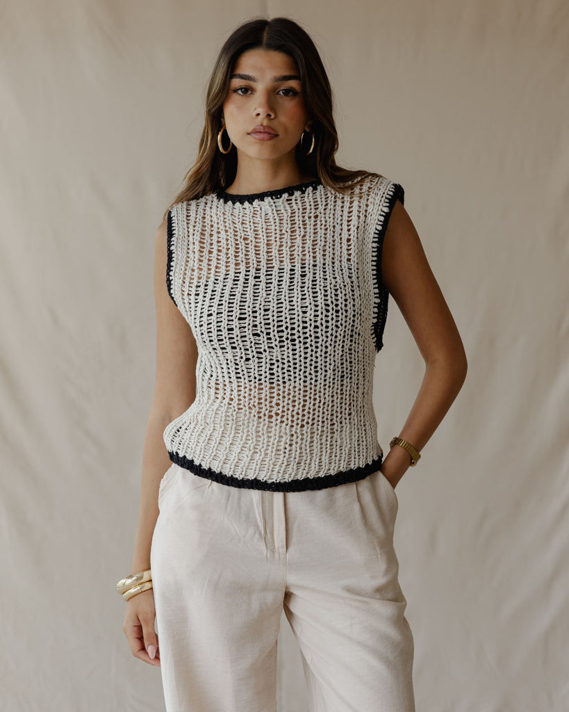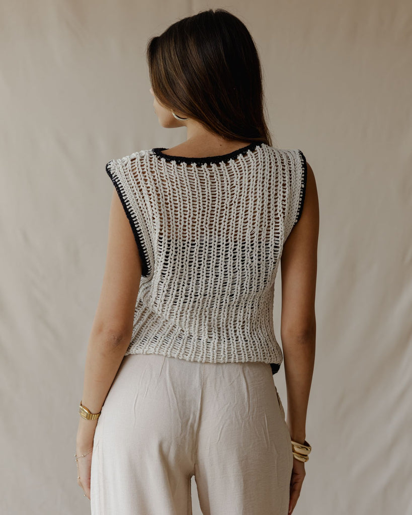 حافظي على أناقتكِ بكل سهولة مع بلوزة التريكو الكروشيه المصنوعة يدويًا، والمُصممة بخياطة ناعمة ومفتوحة. لون بيج فاتح مع لمسات من الكحلي يُضفي لمسة بسيطة وأنيقة.