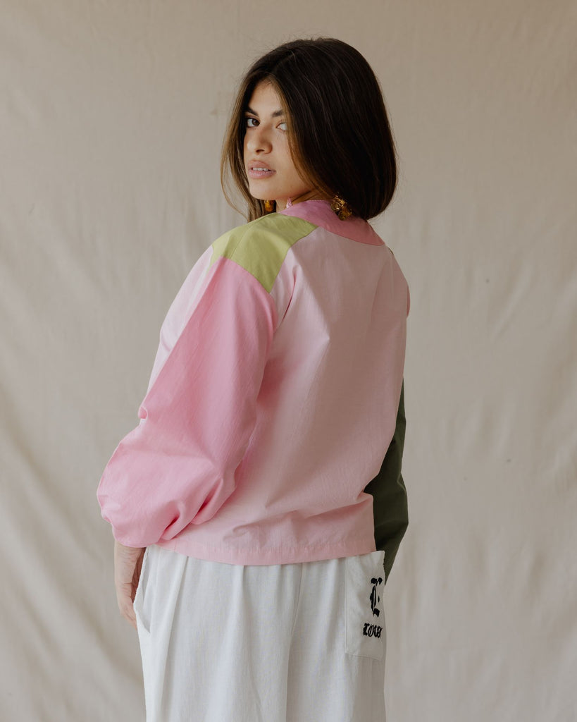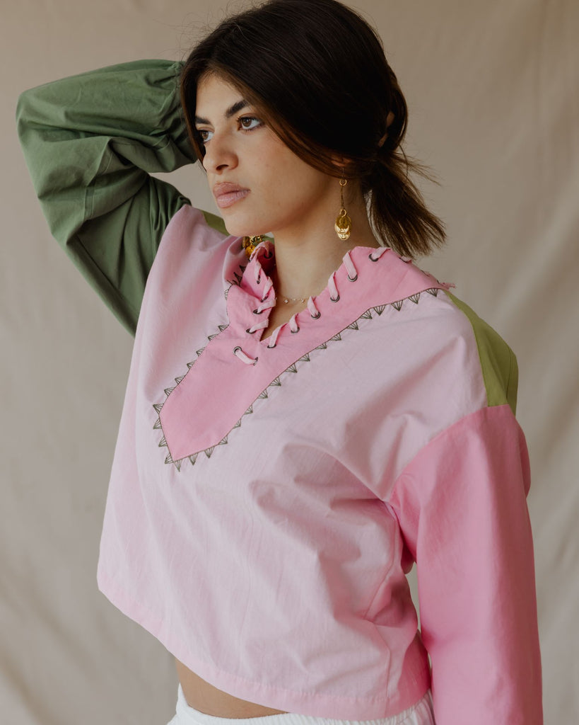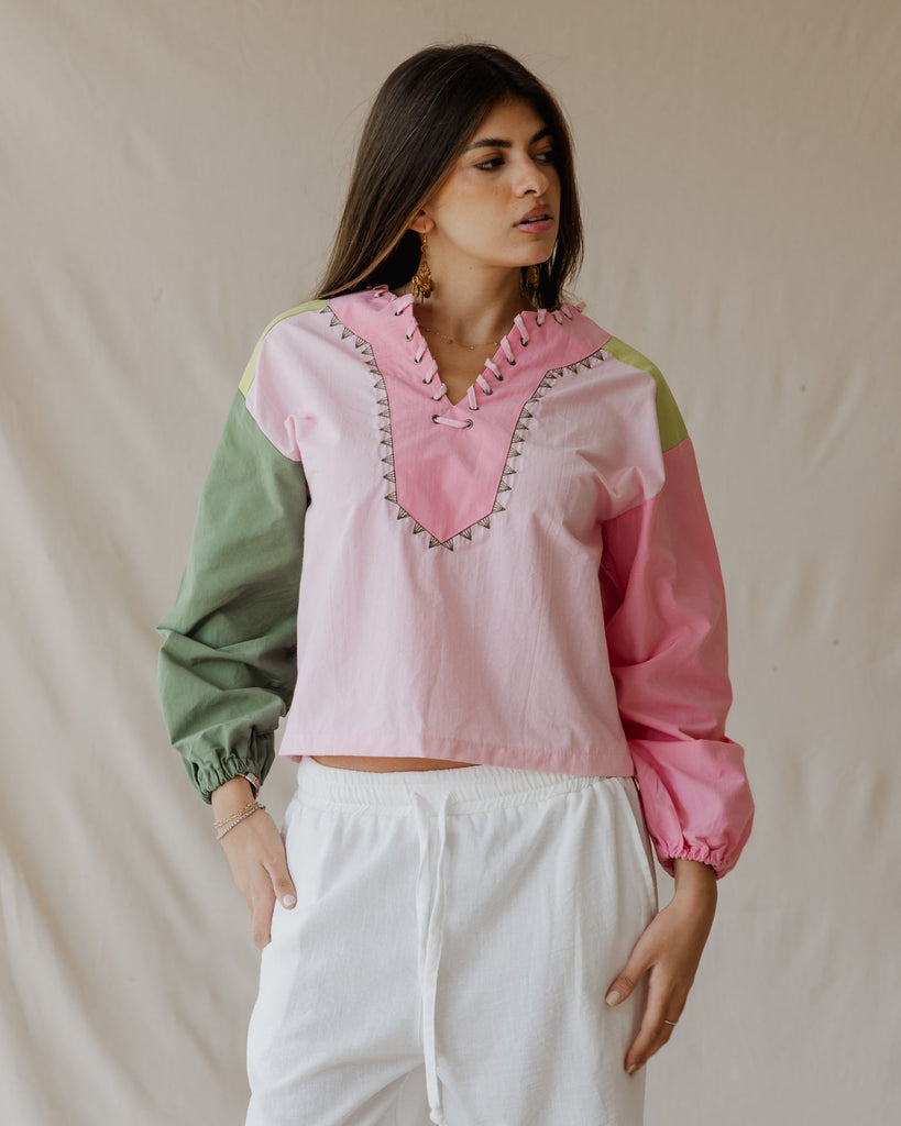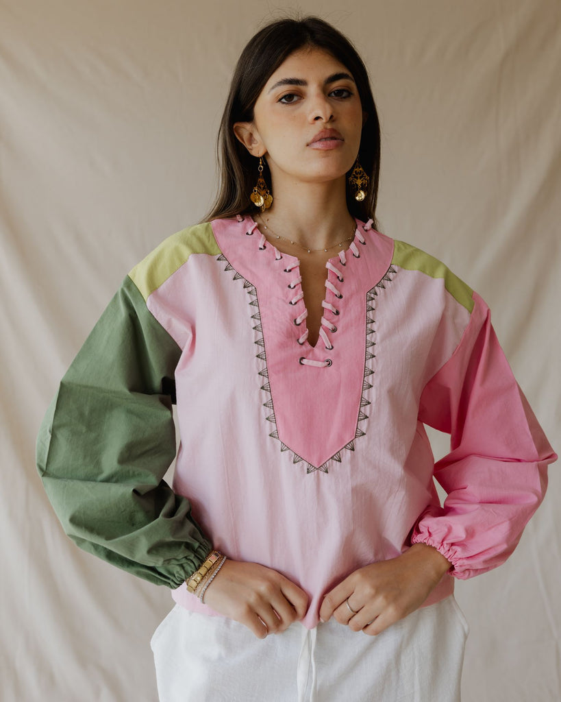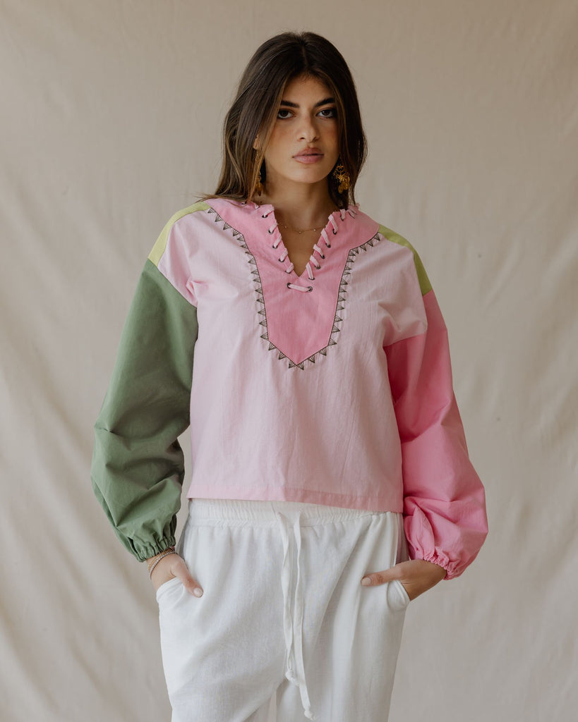 بلوزة مريحة بأكمام متباينة وتفاصيل يدوية الصنع - تباين الألوان المرح والقطن الناعم يجعلها سهلة الارتداء وسهلة الحب وجريئة بما يكفي لتبرز مع الحفاظ على البساطة الكافية للاستخدام اليومي.