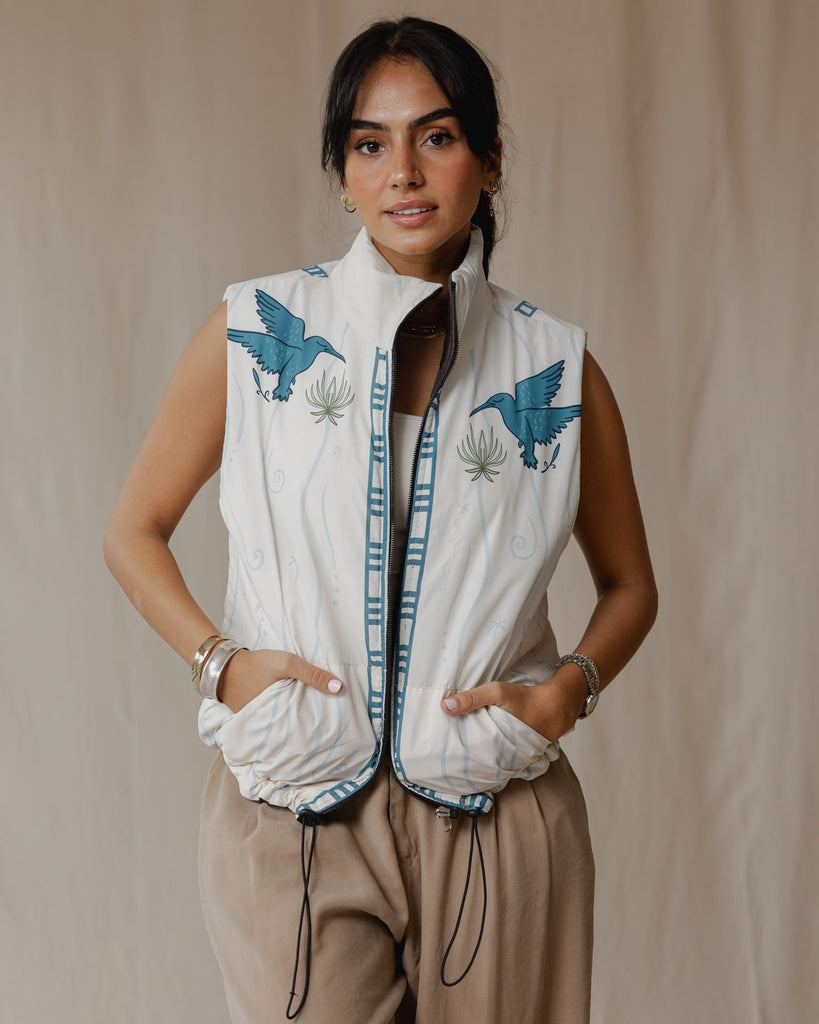 سترة منتفخة مقاومة للماء وقابلة للعكس، بطبعات جريئة على الجانبين. مبطنة بطبقة خفيفة للدفء دون زيادة حجمها، مثالية للارتداء فوق الملابس المحبوكة والقمصان، مع جيوب أمامية وسحاب إغلاق يجعلها عملية وجذابة في آن واحد.