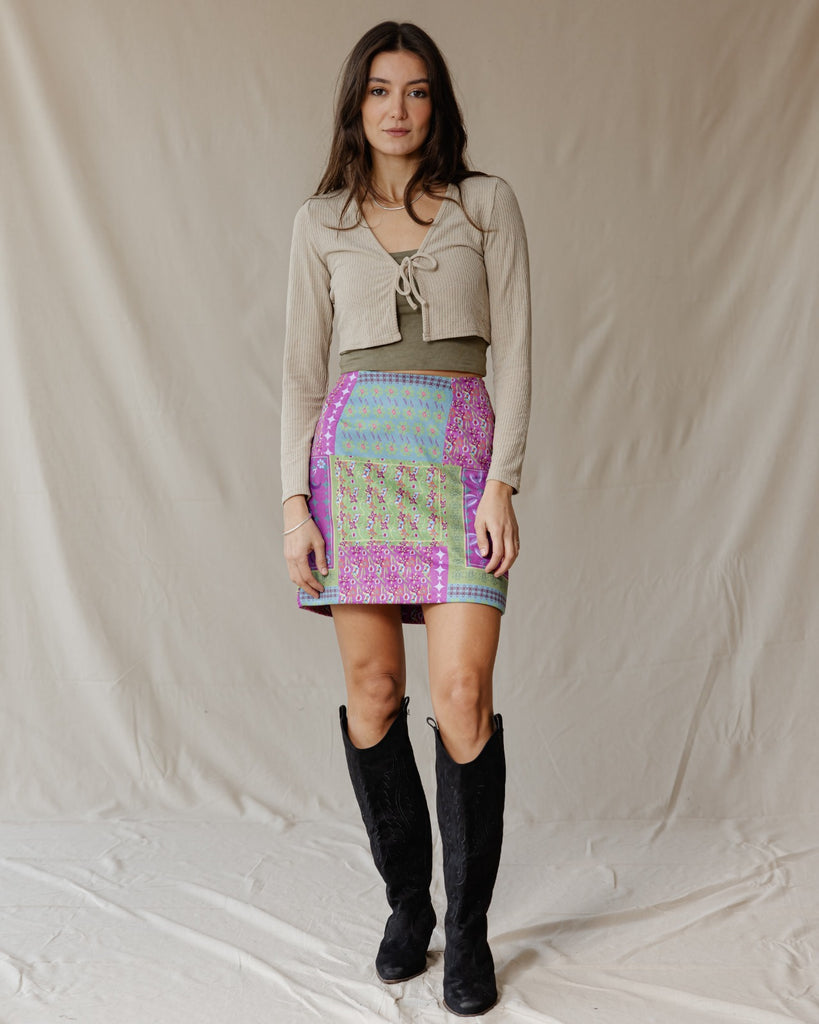 يرجى ملاحظة: تصميم الترقيع يجعل كل تنورة فريدة من نوعها، لذلك قد يختلف ترتيب النمط عن الصورة.