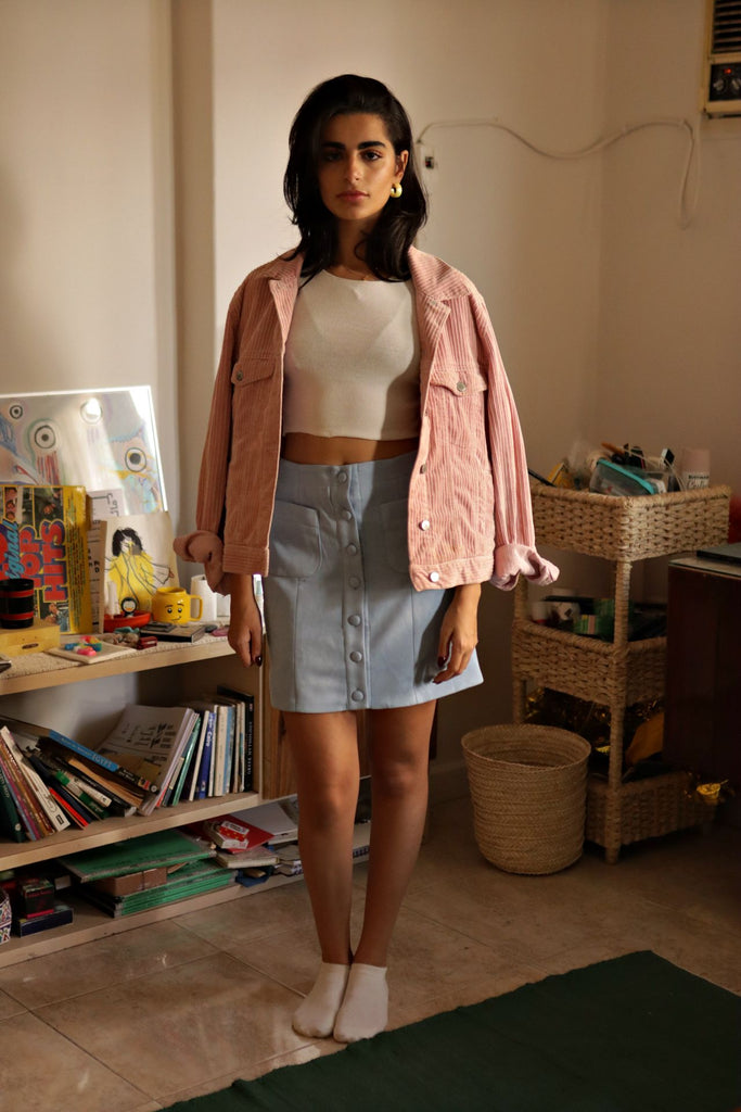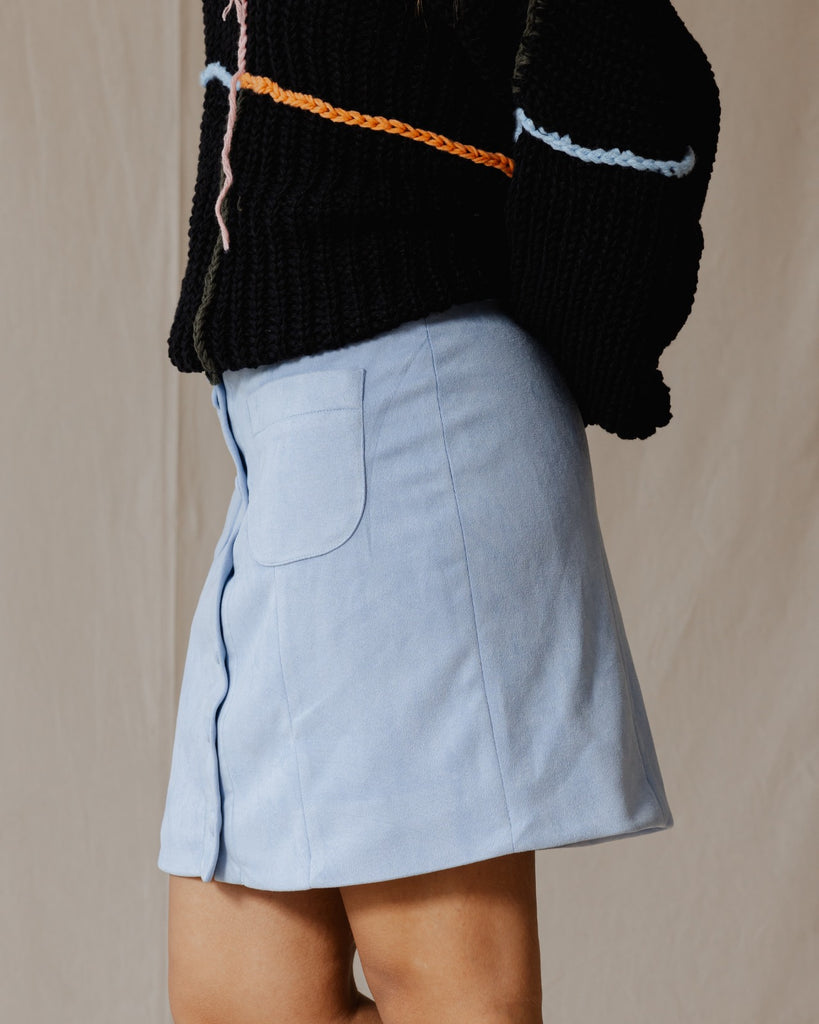 تتميز هذه التنورة الصغيرة المصنوعة من جلد السويد بصف من الأزرار التي تضفي عليها سحرًا رقيقًا. ناعمة ومريحة، وهي مثالية للارتداء الرسمي أو غير الرسمي.