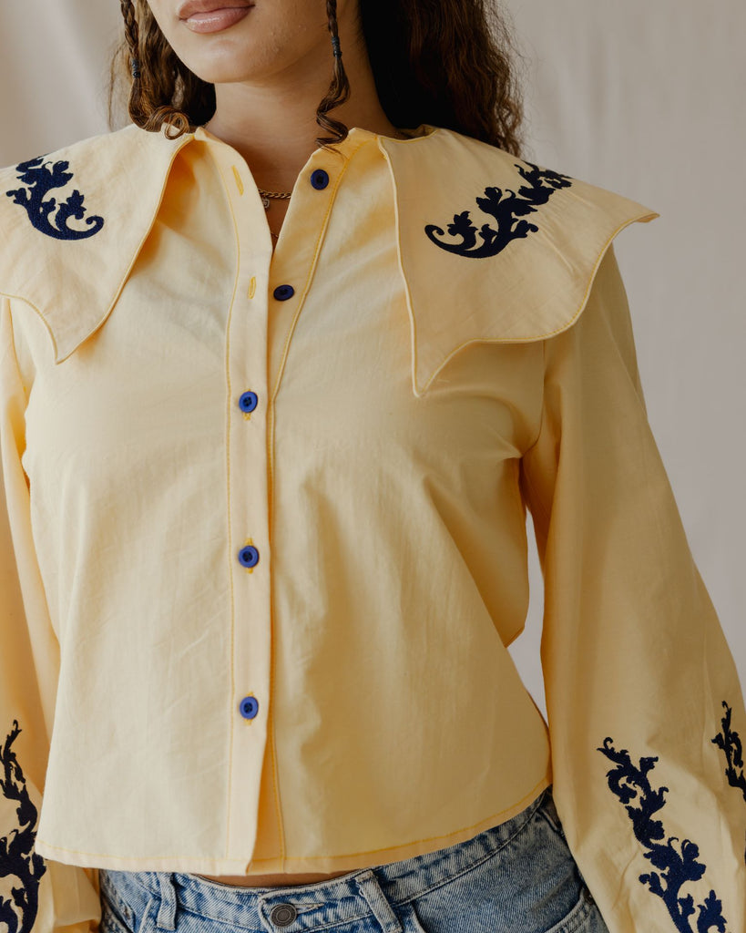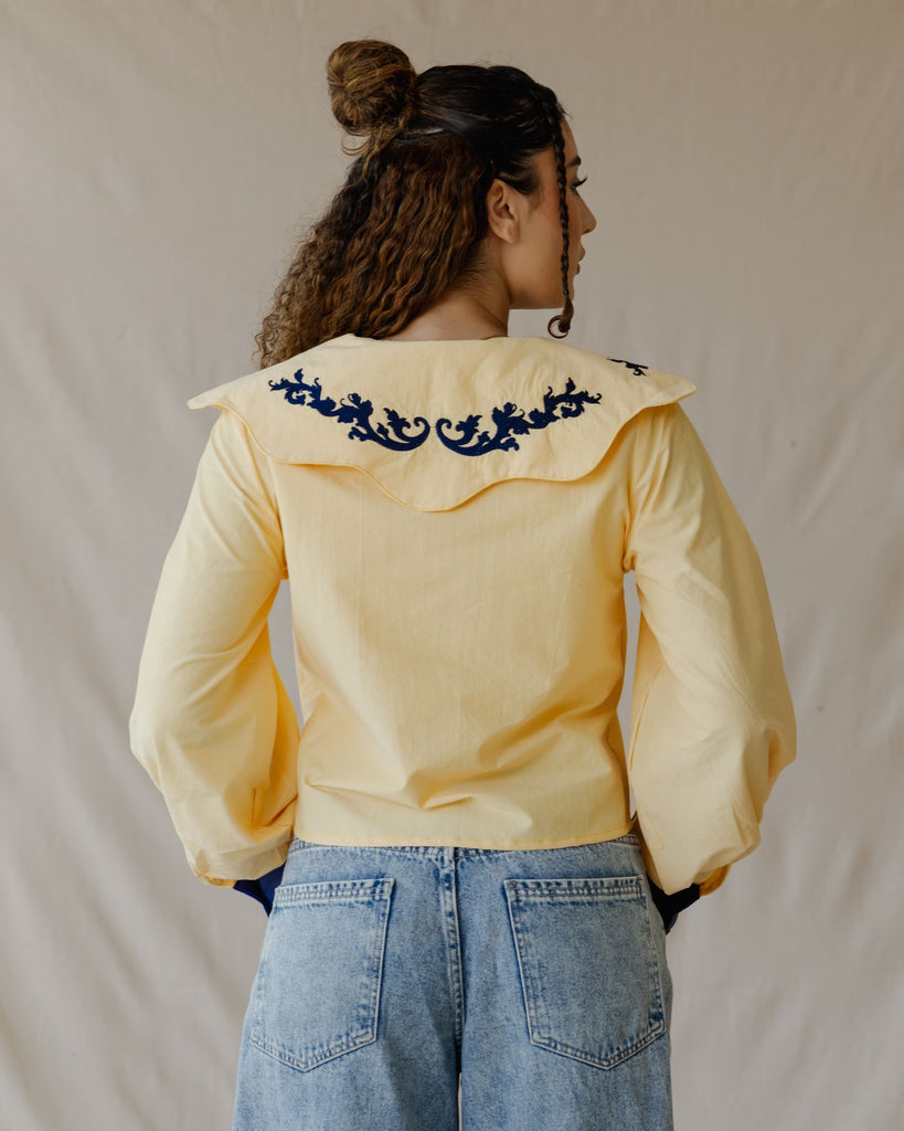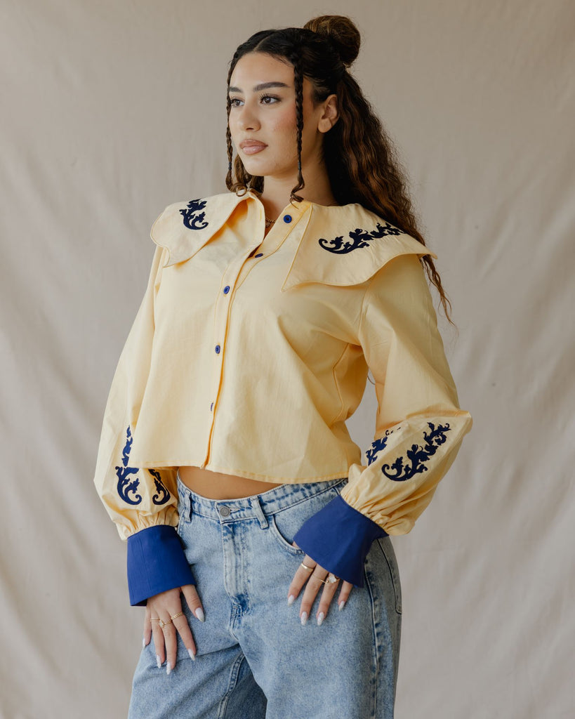 لمسة عصرية على التصميم الكلاسيكي. تتميز هذه البلوزة بياقة واسعة وتطريز مميز على الأكمام - قطعة جريئة وأنثوية في آن واحد، تبرز أناقتها بكل سهولة.