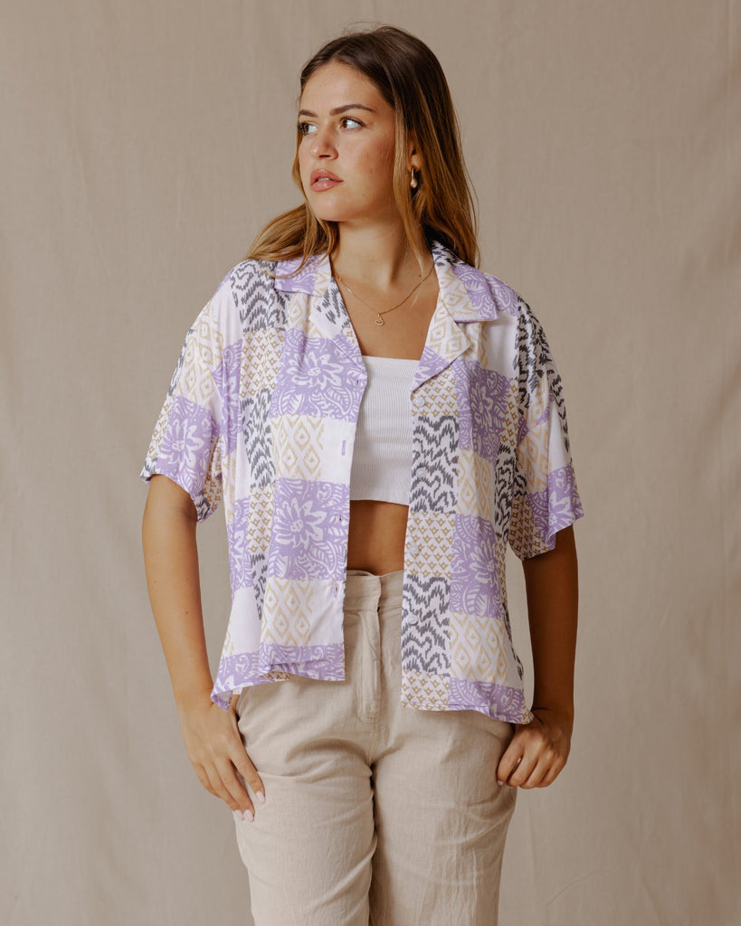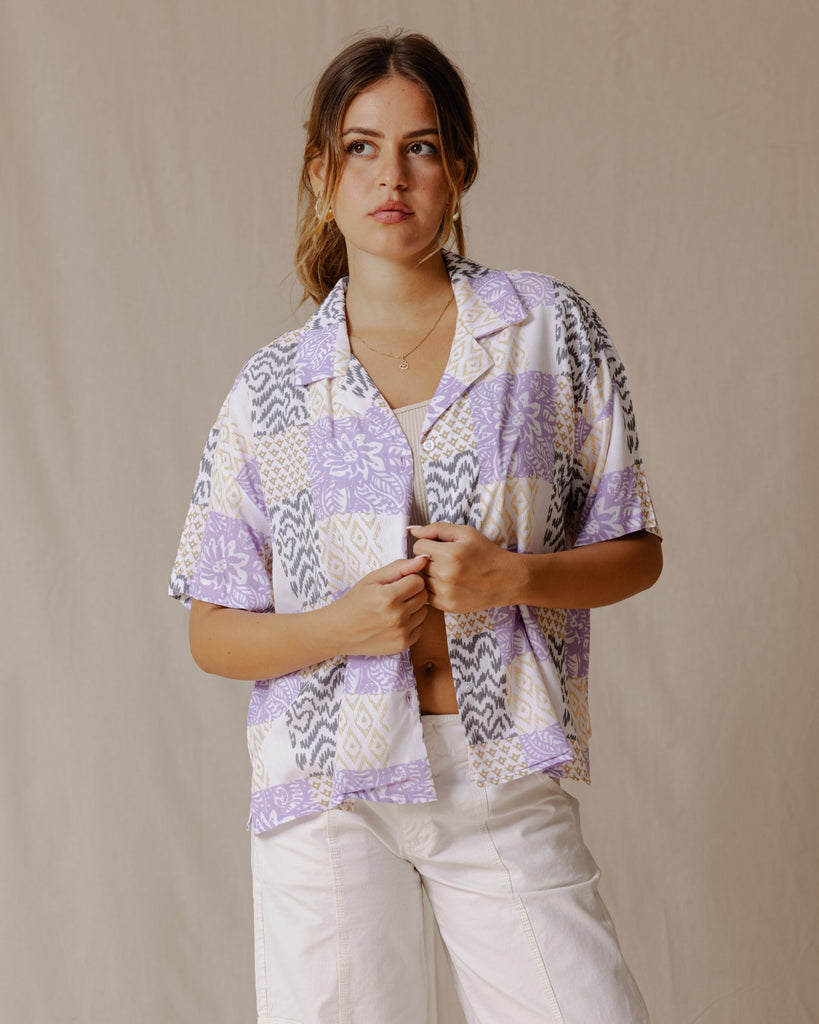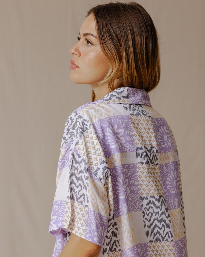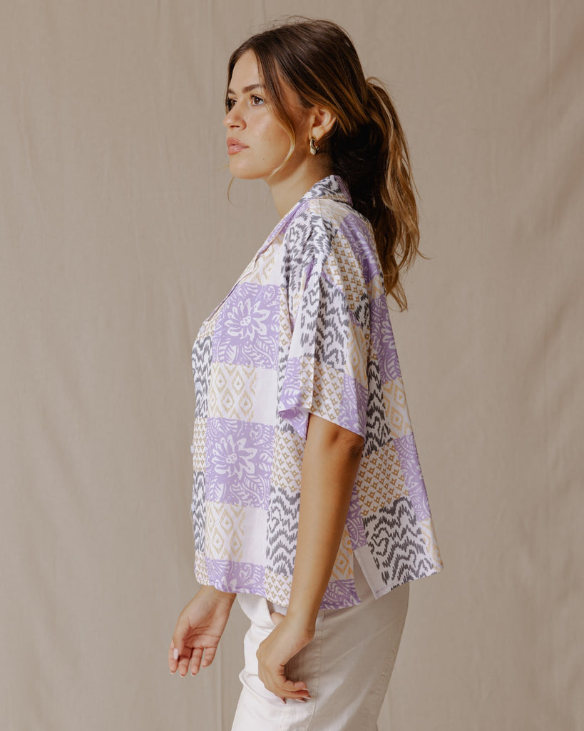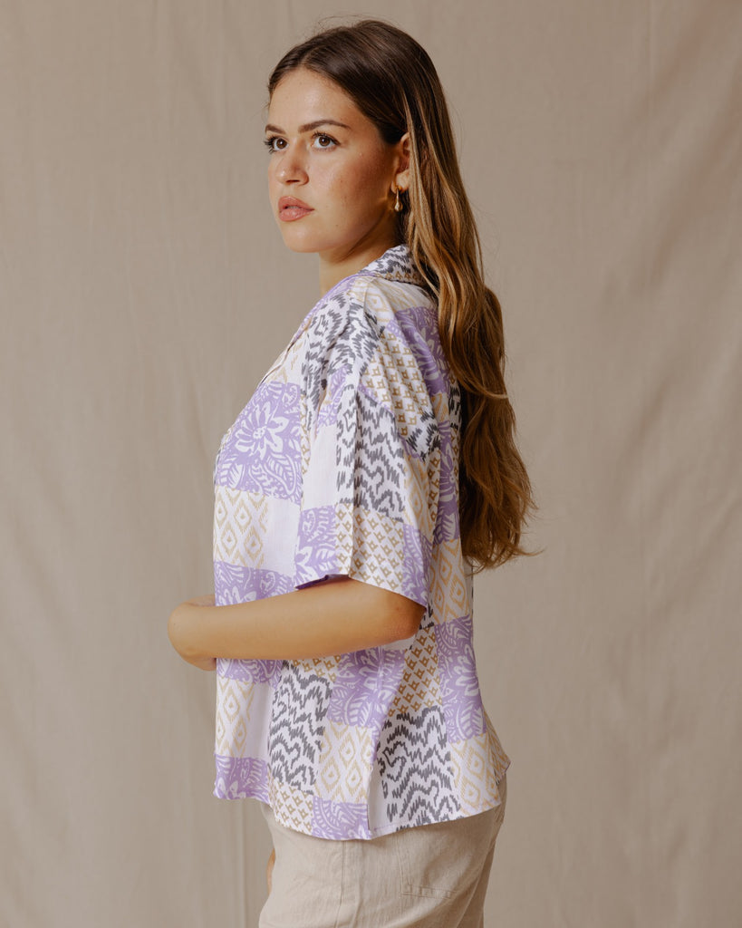 يتميز هذا القميص الصيفي المقصوص بتصميم مرقع مرح. صُمم هذا القميص لتوفير الراحة والأناقة، كما أن نسيجه خفيف الوزن مثالي للطقس الدافئ والملابس غير الرسمية.