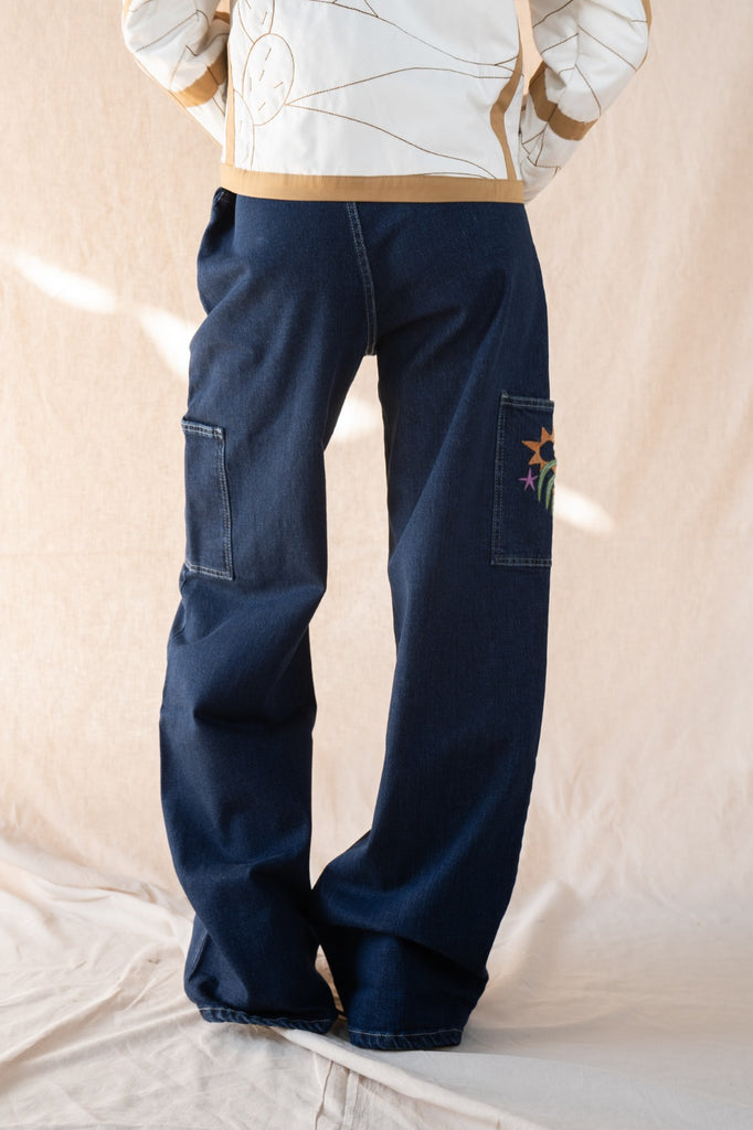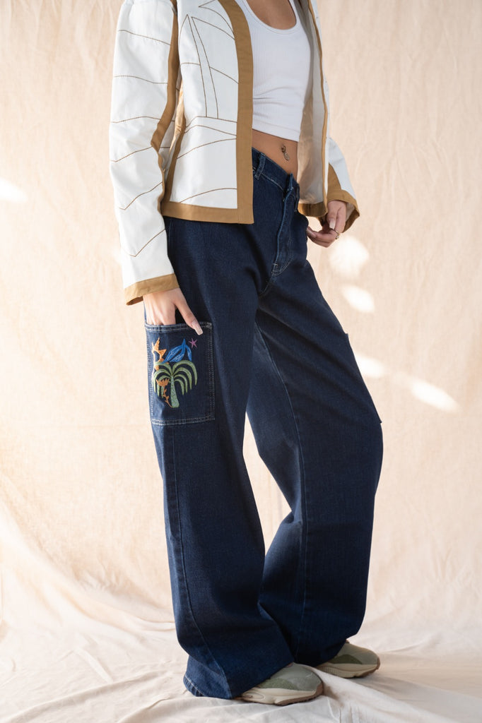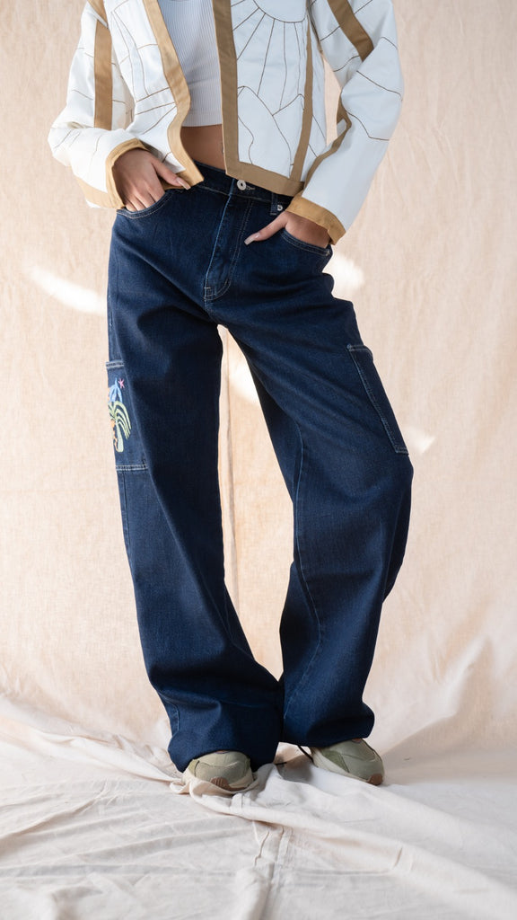 تتميز هذه السراويل الجينز الكلاسيكية بتفاصيل مطرزة دقيقة على الجيب الجانبي، مما يضيف لمسة من الشخصية إلى التصميم الخالد.