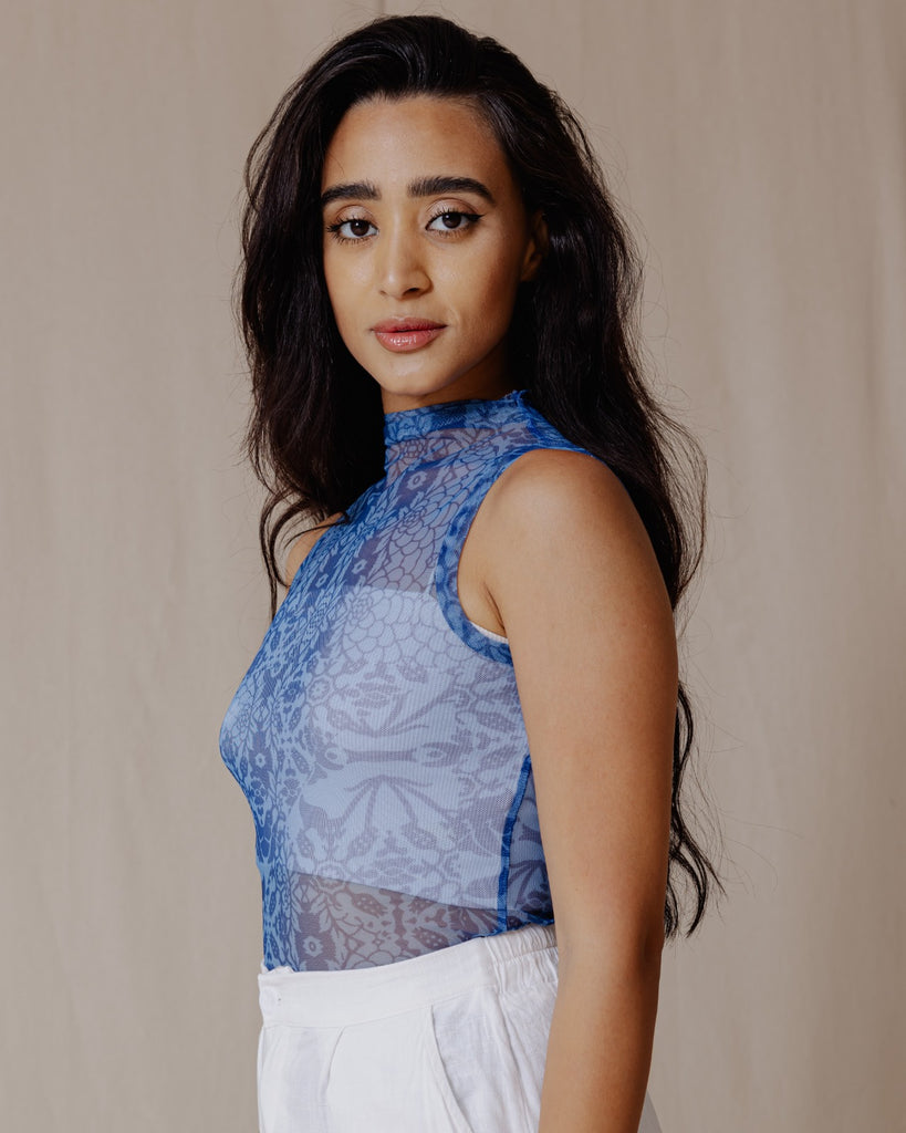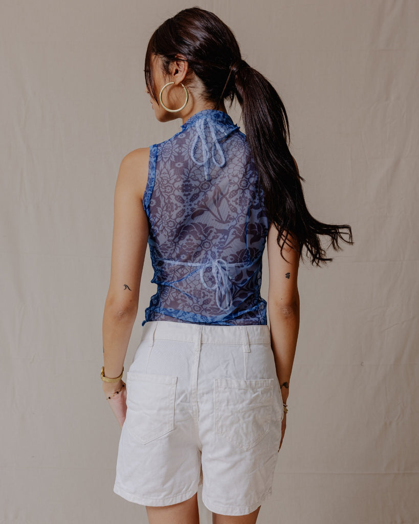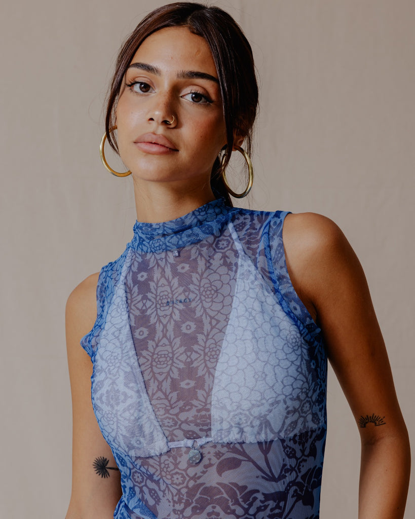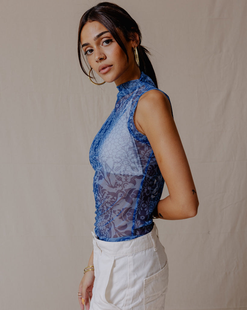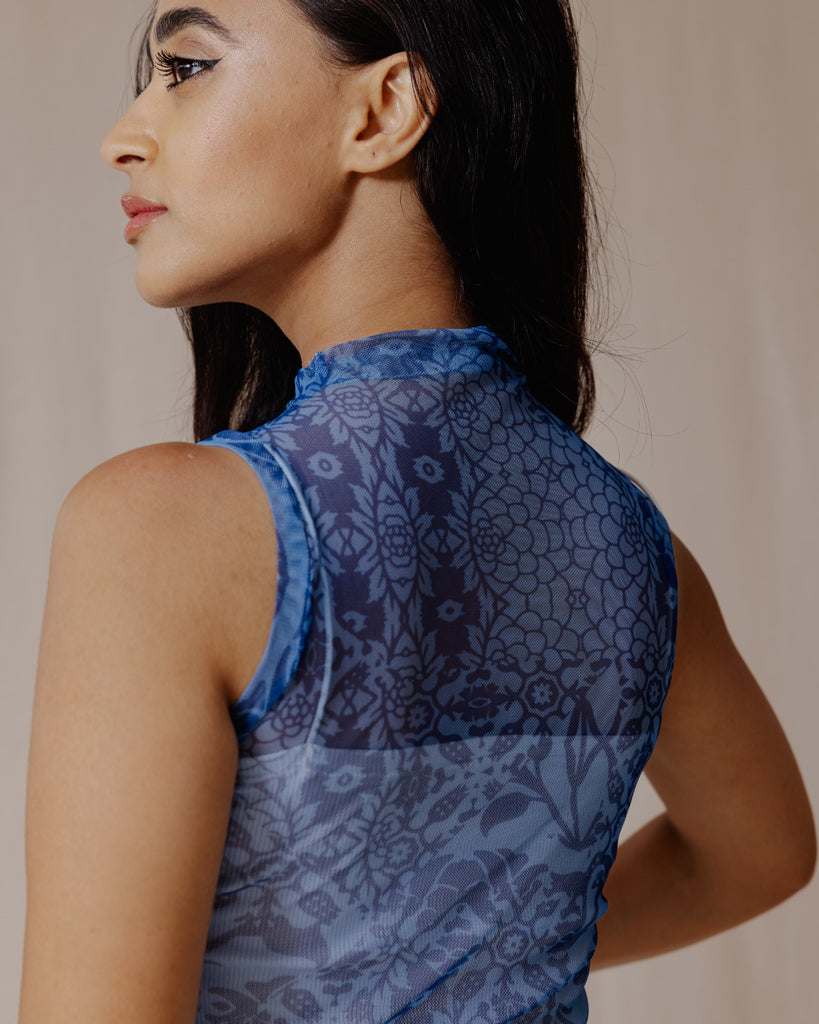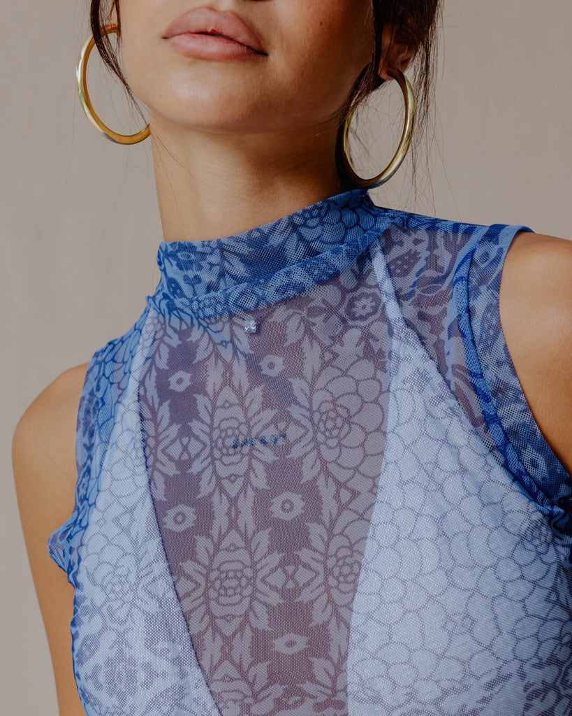 بلوزة شبكية مزخرفة بزهور باللون الأزرق