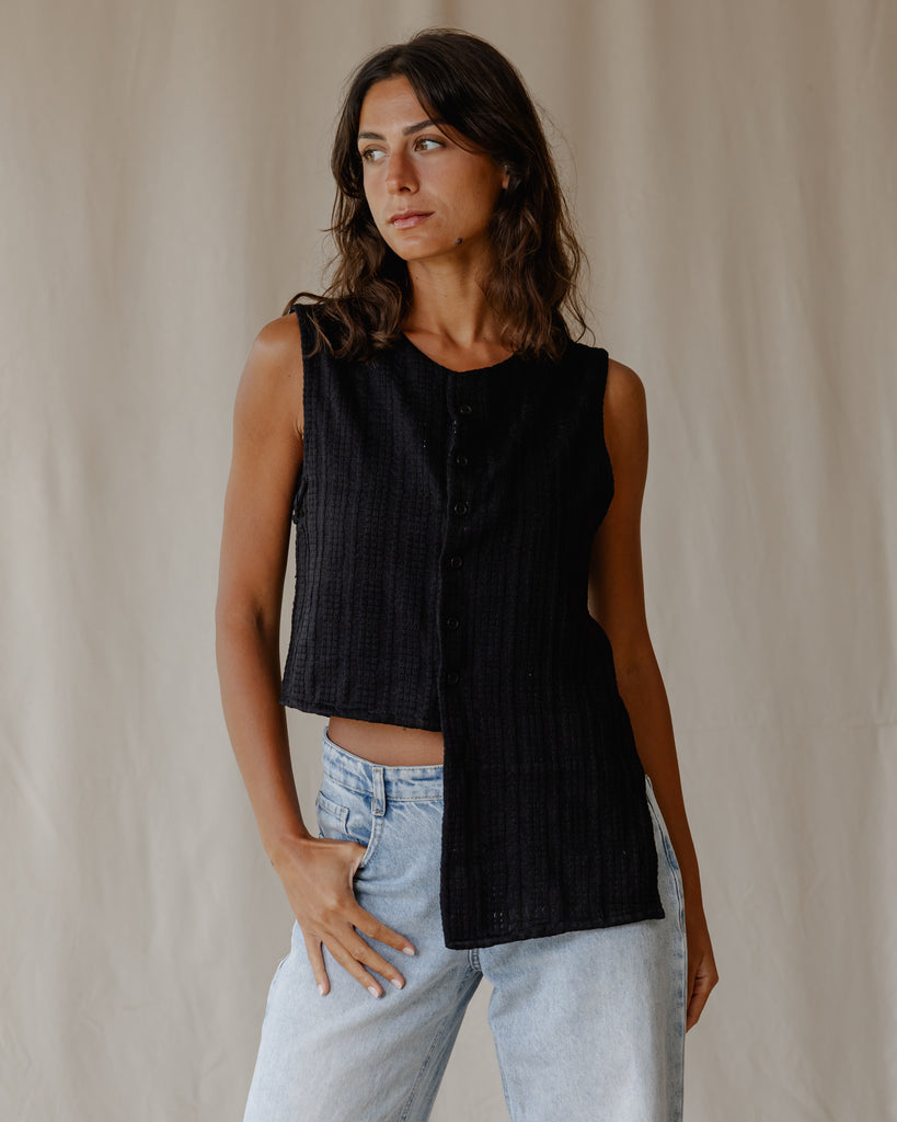 تضفي هذه السترة ذات التصميم البسيط لمسة عصرية على الأسلوب اليومي بفضل قطعها غير المتماثلة وثنياتها السهلة.