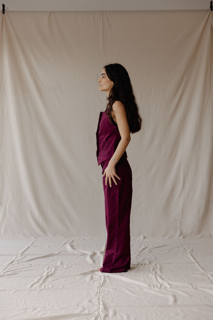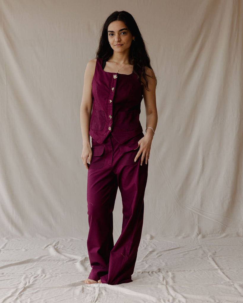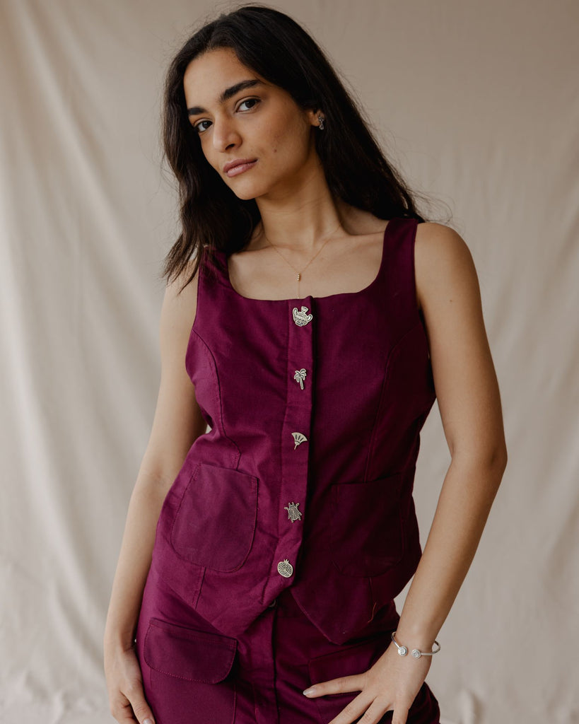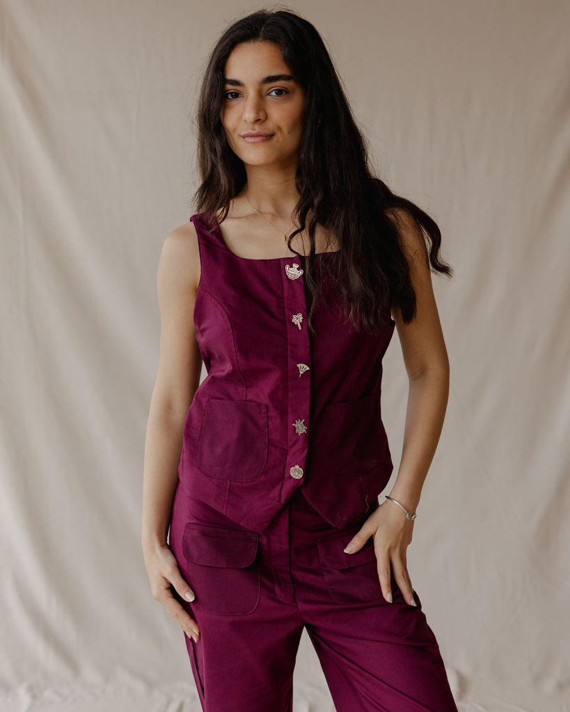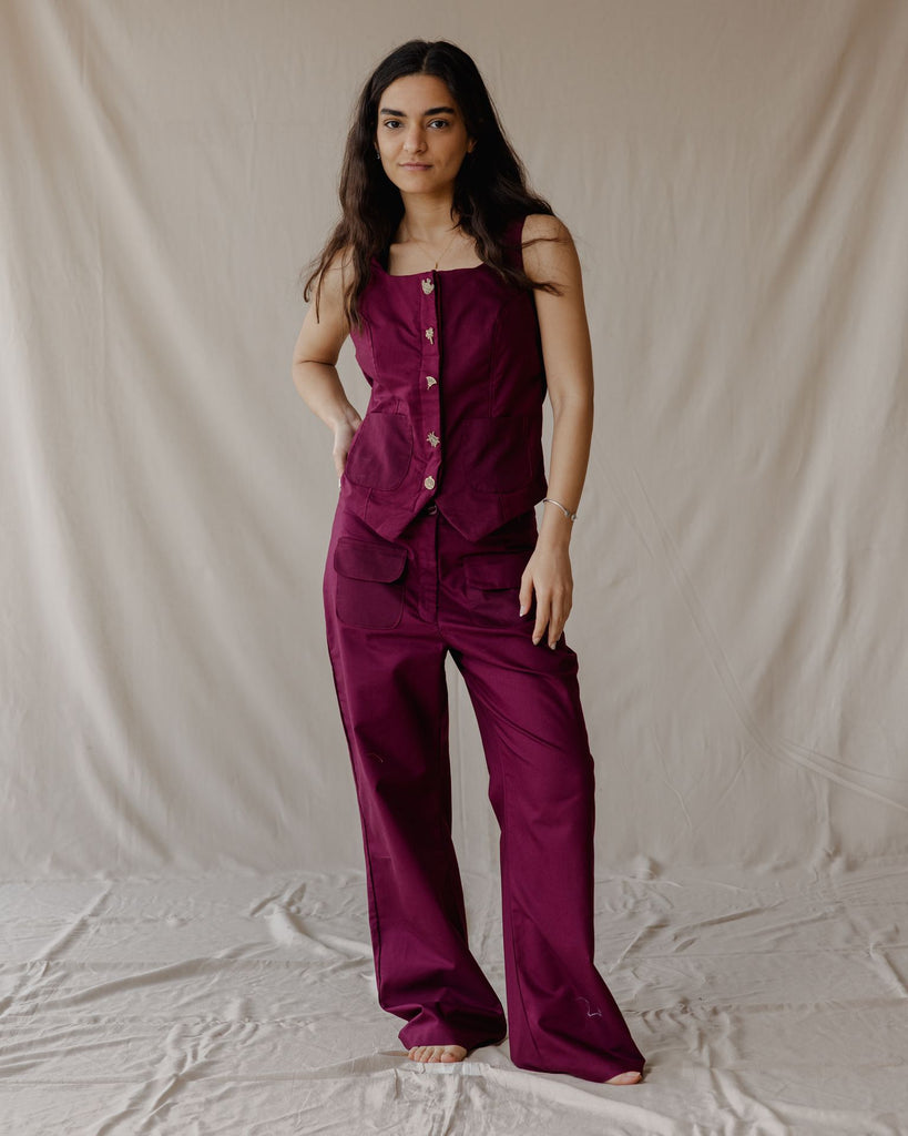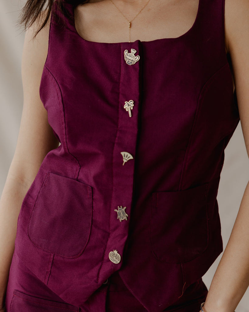 This two-piece cotton set features a tailored vest and relaxed-fit pants with front pockets. The vest is designed with hidden buttons for clean functionality and topped with detachable copper buttons that snap on like earrings—style it your way without compromising closure. Effortless to wear together or separately, it's a versatile staple made for everyday ease.