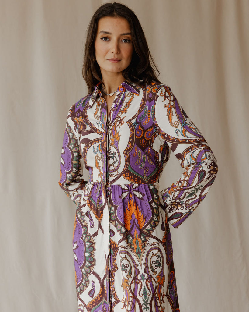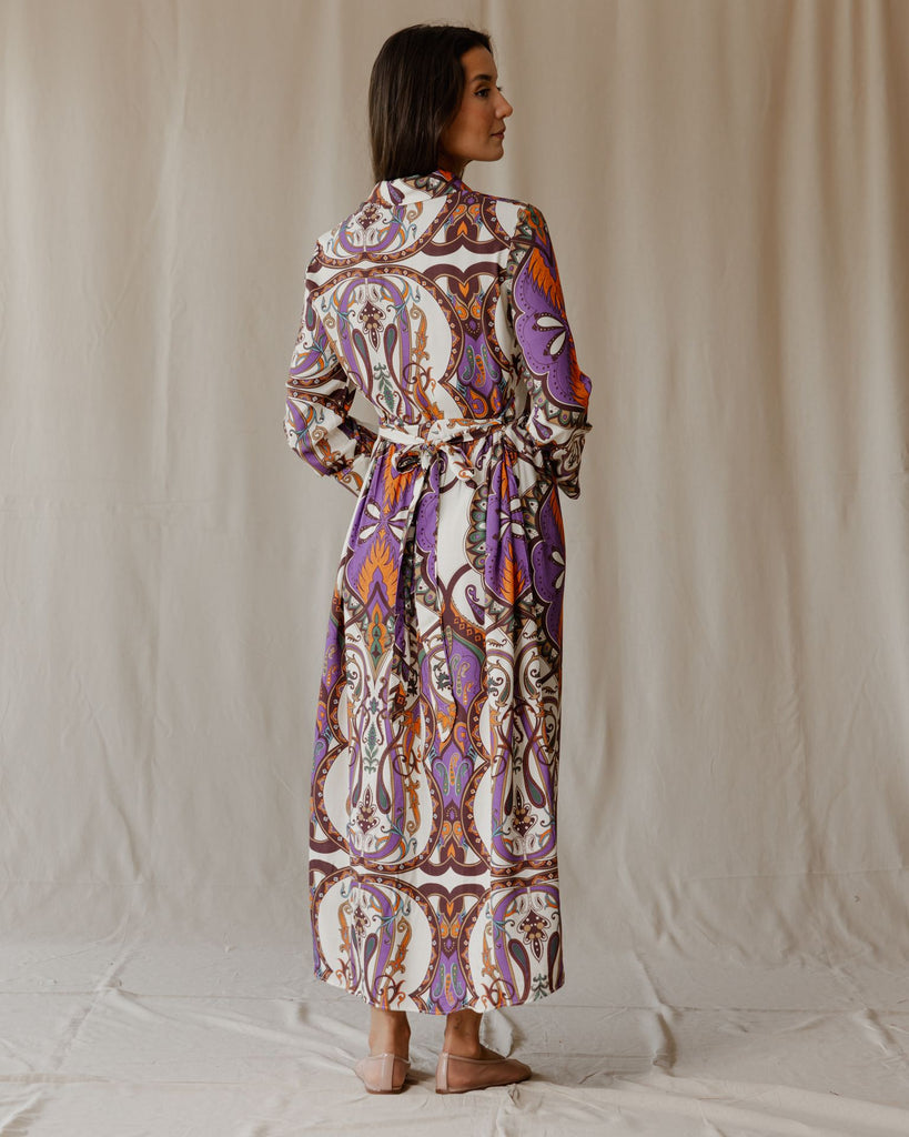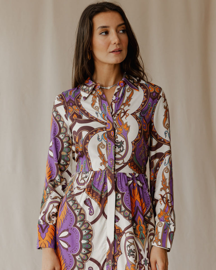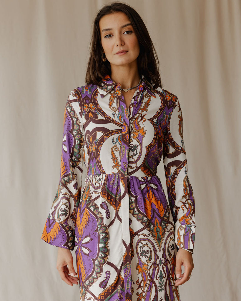 Step out in a work of art with this gorgeous midi dress. Its classic button-down front and flowing A-line shape create a look that's both elegant and effortless. The cinched waist and breezy, full-length sleeves give it a super flattering fit, while the bold, artistic paisley print is guaranteed to turn heads. It’s the perfect blend of timeless style and modern flair.