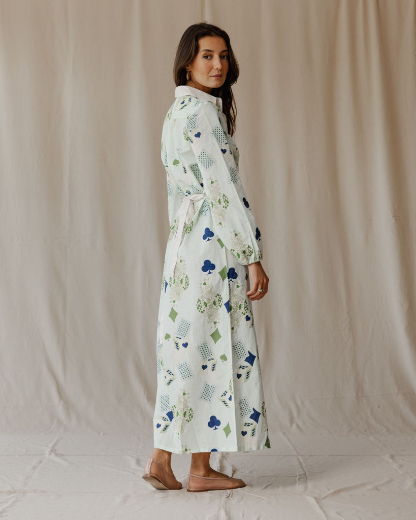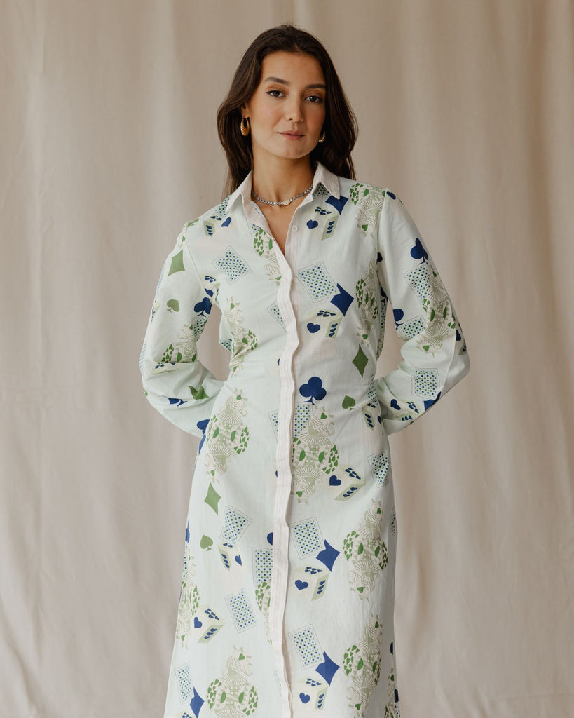 Turn heads in our Royal Flush Midi Dress. A button-down with a cool mix of paisleys and playing cards, giving you a stylish and unique look.