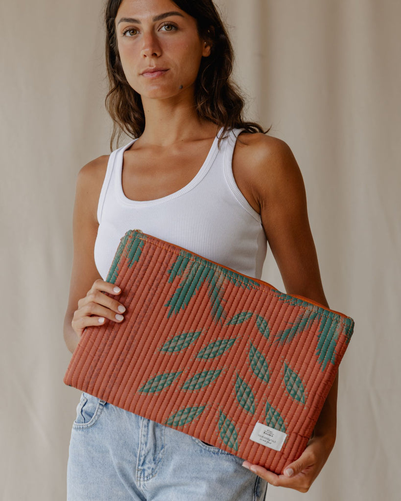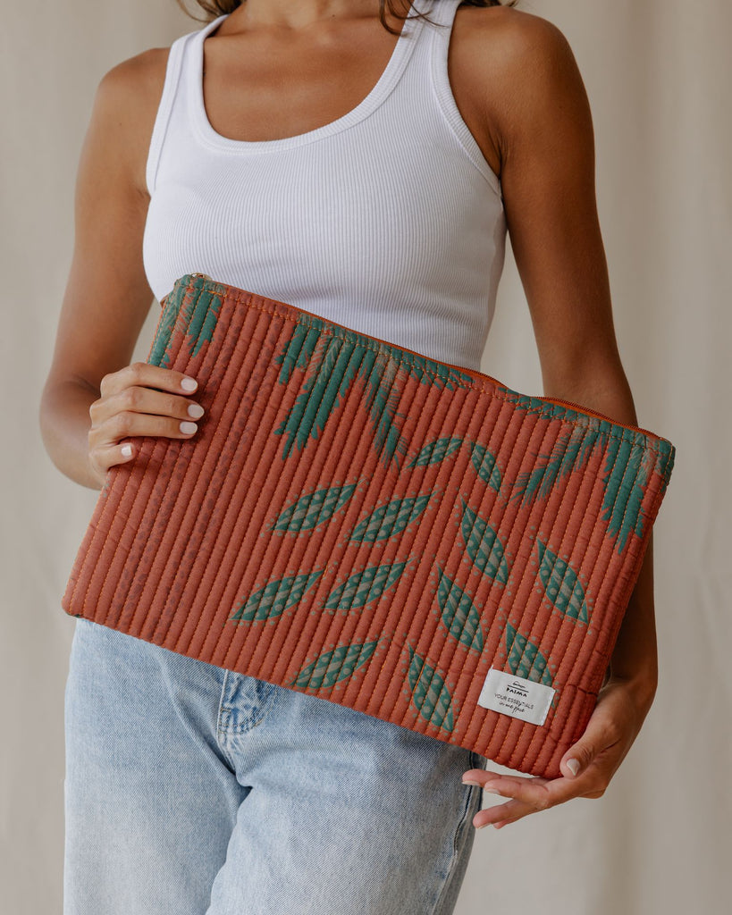 A stylish and protective laptop sleeve with a soft quilted texture and a tropical-inspired print. Perfect for keeping your laptop safe on the go.